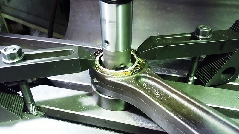大型車のコンロッドで、ピストンピンブッシュの入れ替え後、内径仕上げをしているところです。