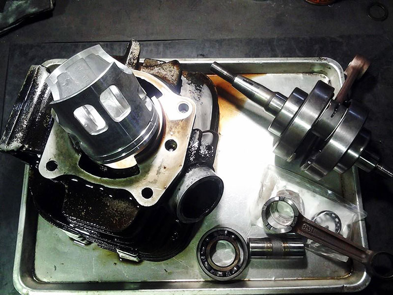 オイルポンプの作動不良によるシリンダーの焼き付きとクランクピンの摩耗とベアリングの焼き付きでした。シリンダーはオーバーサイズにボーリングし直し、クランクはコンロッド、ニードル、クランクピン、ワッシャーをすべて新品の交換して組み直しました。2サイクルの場合、このようなトラブルが頻繁におきますので、保険の意味で燃料も混合燃料にしておくといいかと思います。